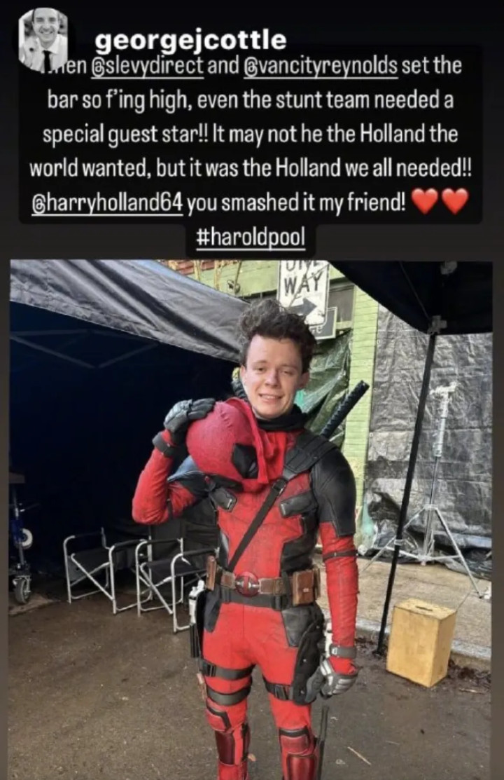《死侍与金刚狼》特技动作演员George Cottle在社交媒体爆料了不少变体死侍的幕后照,结果意外爆料了,汤姆·霍兰德弟弟哈里·霍兰德客串出演了《死侍与金刚狼》饰演一个死侍变体的事情。
